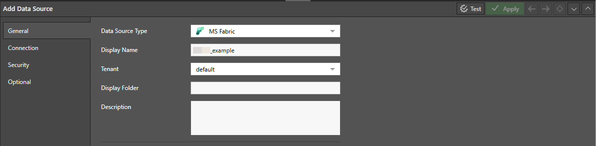 On the General tab, select MS Fabric as the Data Source Type and enter a Display name: