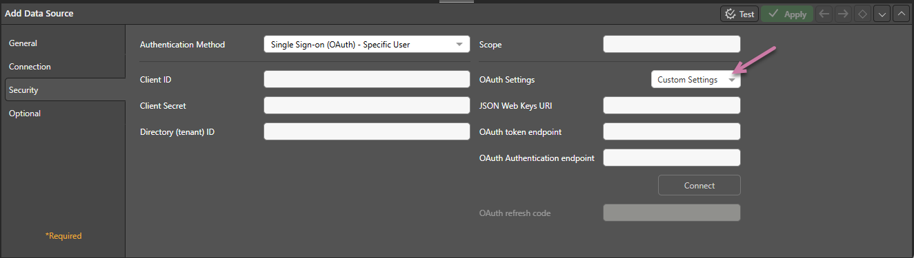 If you are setting up Single Sign-on (OAuth) - Specific User, you should click Connect to connect to the data source and generate an OAuth refresh code. Only do this once you have supplied the provider settings.