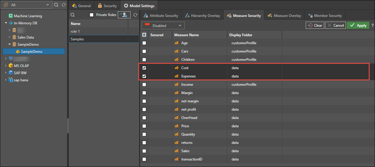 In the image below, the Cost and Expenses measures are disabled for the Samples role; the rest of the measures will remain enabled for the given role.