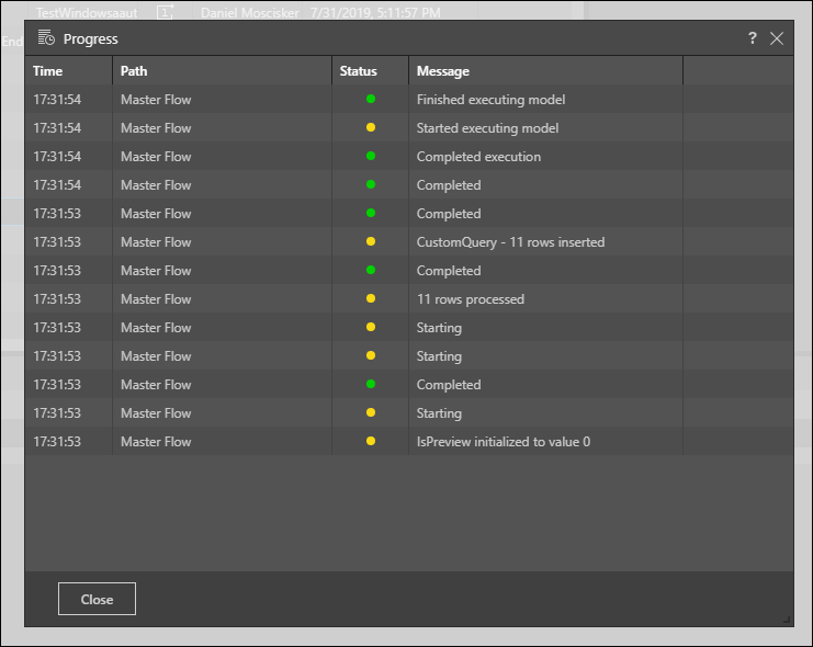 To access the progress dialog for a given model job, click the "data flow" ETL progress icon from the job's Actions column in the Output panel. The dialog displays each component of the ETL in reverse chronological order.