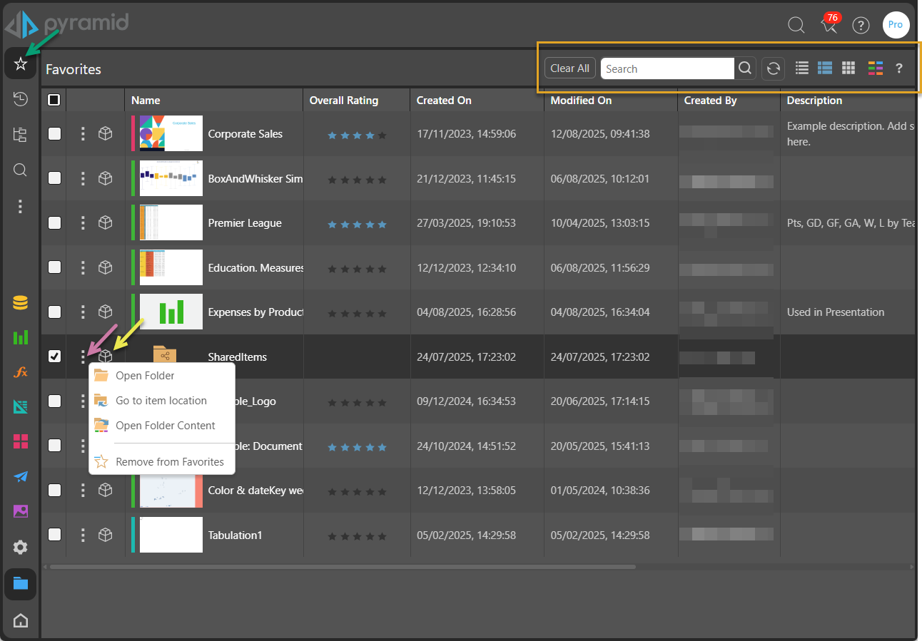 By default, Favorites is the first view users see when accessing the Content Manager, provided they have marked items or folders as favorites. Favorites typically appears at the top of the CMS toolbox (indicated by a green arrow in the main view) and can be configured as the Default Content View for Pros or Admins opening the CMS.