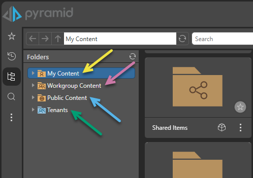 Folders are broken into three domains: My Content (yellow arrow below), Workgroup Content (purple arrow), and Public Content (blue arrow). Administrators will see an additional folder called Tenants (green arrow).