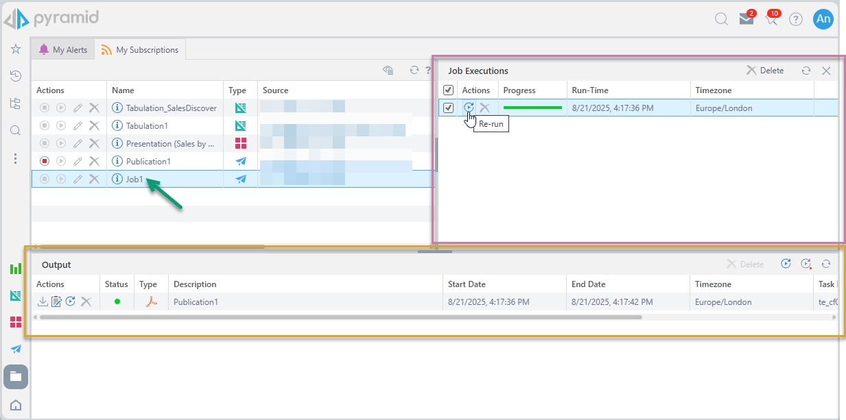 The Output panel displays the results of job executions. (The outputs are for the selected job executions.) Each output entry includes the following columns: