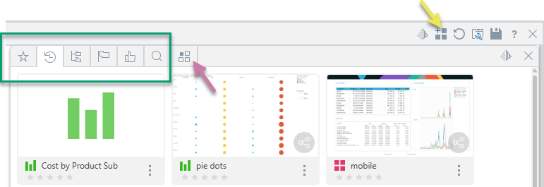 Use Add Content or Widget (yellow arrow below) to open the Content Directory panel, where you can select a presentation, discovery, or "widget preset" to add to the current tab. Note: If your currently selected tab contains no current content items, there is also a Add Content or Widget tile that you can click to access the same function.