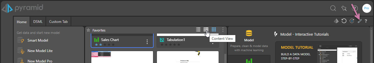 - Welcome: Opens the Quick Start and Learning Center dialog, letting Pro users quickly start new Model and Discover sessions or jump to the Content management tools.