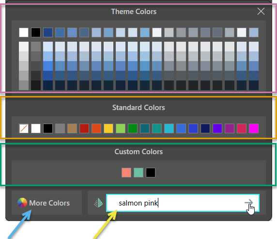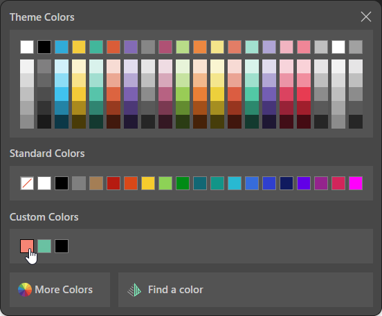 When any color picker is opened, the first category of colors to choose from is Theme Colors. Theme Colors are all the colors that exist in the currently selected theme. In the preceding image, the chosen theme is Pyramid 2025 and the Theme Colors panel shows all colors associated with that selected theme.