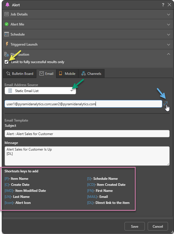 Use this option to distribute publications, alerts, or subscriptions by email. This is a good idea if you want to send the scheduled message to users who don't have access to Pyramid, or if you want to ensure the scheduled content will be seen quickly by the relevant recipients.