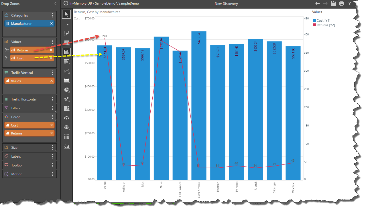 Add the measure that should be used to label the chart to the Labels drop zone. In this example, the chart displays Sales by Manufacturer, but the columns are labeled by Net Margin.