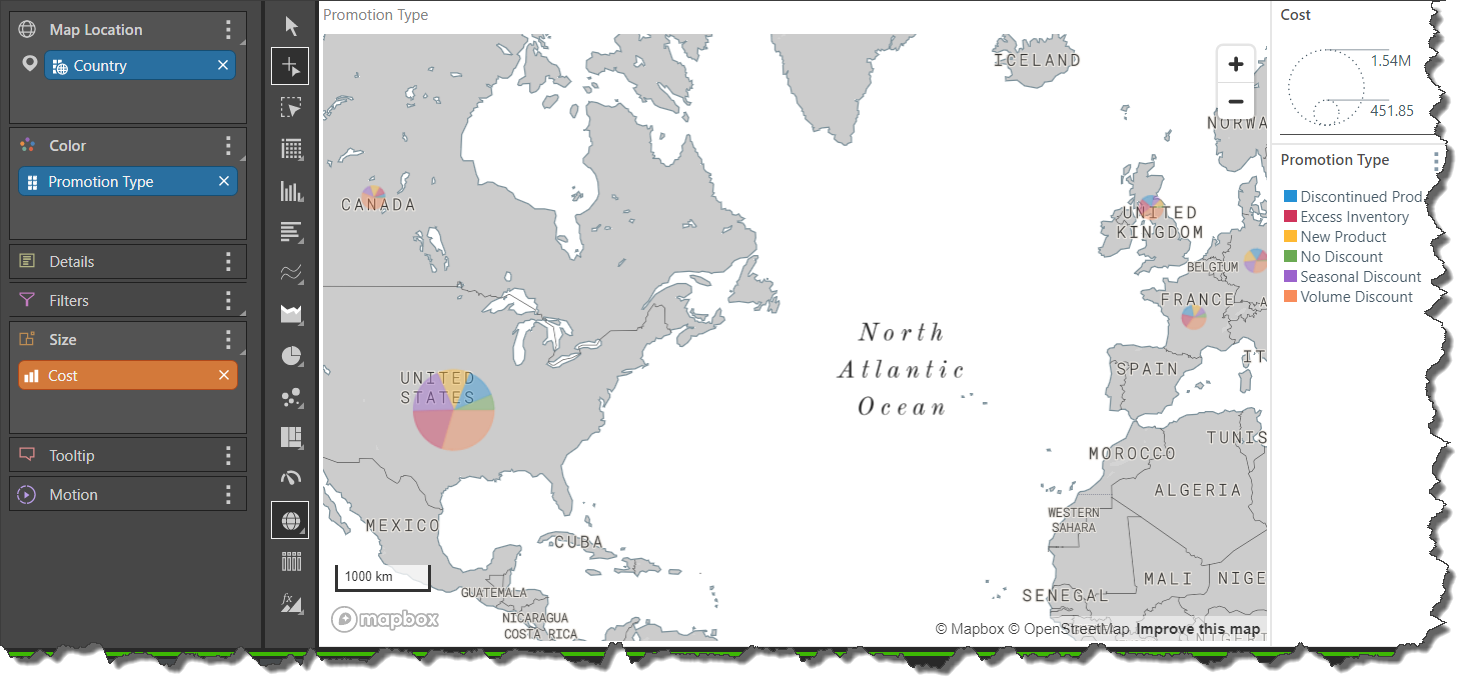 In the example below, the County hierarchy was added to Map Location; each country is represented with a bubble. The Cost measure was added to Size, so that cost is driving the size of each bubble. The Promotion Type hierarchy was then added to Color, splitting each bubble into a pie with each segment representing a promotion category.