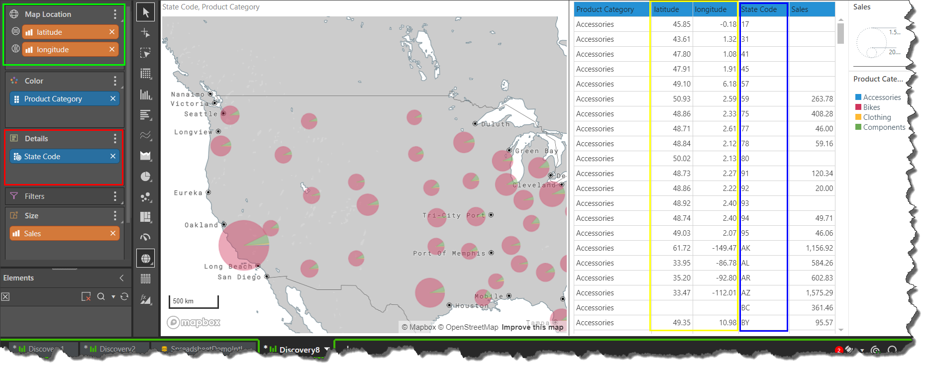 In order to populate the map with latitude and longitude date, the State Code hierarchy was added to the Details zone (red highlight below). In the data grid on the right, we can see that each row in the State Code column (blue highlight) corresponds to a specific latitude and longitude (yellow highlight). The corresponding coordinates are therefore mapped accordingly.