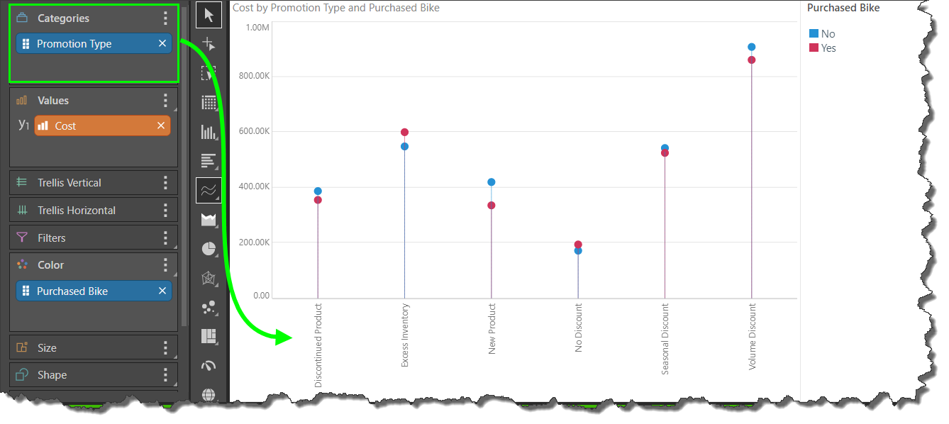 The location of the Categories chip in the visual will be determined by the selected visual type. For instance, column, area, and line charts present the categories along the y-axis, while bar charts present the categories on the x-axis. The example below shows a lollipop chart; this chart type displays the measures on they-axis and categories on the x-axis. Here, the Promotion Type hierarchy was added to Categories, and is displayed along the x-axis (green highlight).