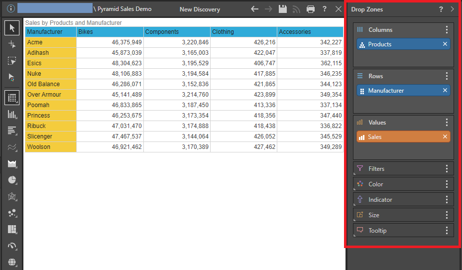 To learn more about how the drop zones drive the visualization, and how the visualization also drives the drop zones, click here.