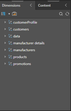 Hierarchies are exposed by expanding the dimensions in the Dimensions panel. Within each dimension are interactive member hierarchy trees (hierarchies) that allow you to browse hierarchical structures within the data model. Click on a dimension (red highlights below) to show its member hierarchies (green highlights). There are a few ways to add a hierarchy to the query: