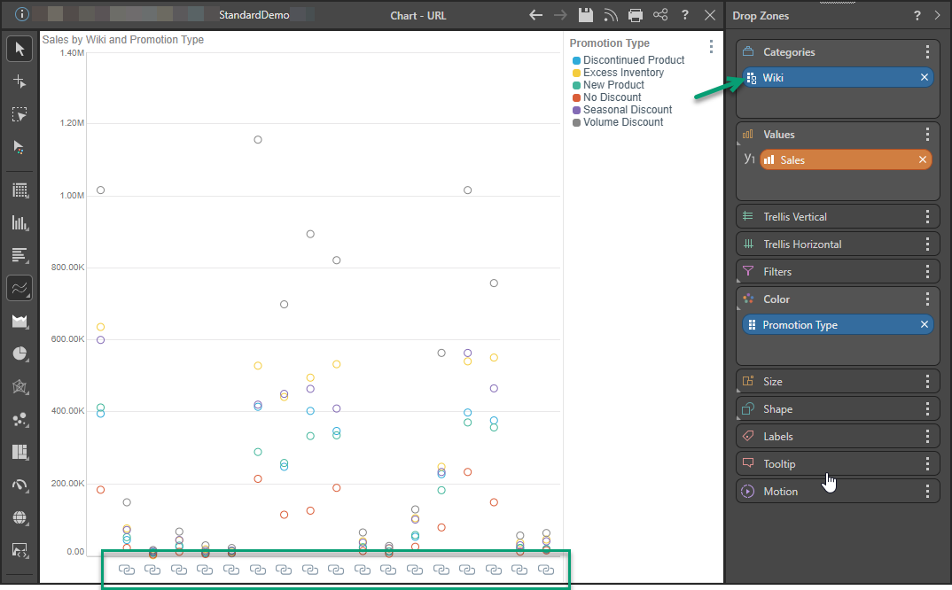 When working with Cartesian charts, add the URL hierarchy to Categories to display the URL links along the main axis. In this example, the URL hierarchy was added to the x-axis of a point chart: