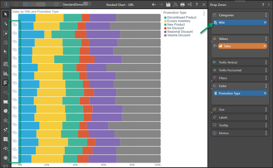 The URL hierarchy adds either the URL link or link images (the standard chain icon) to the grid or chart. Click the link image to open the target URL.
