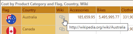 URL Hierarchies can be added to Grids and Cartesian charts. They are included on the visual as a link icon. Clicking the link opens the target URL in a new tab. This is an efficient way to enable users to jump to a URL, without configuring any actions.