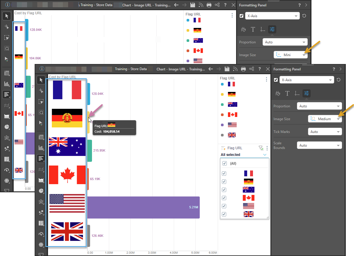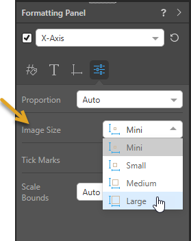 To alter the size of your images, use the Image Size option in the Formatting panel. For Grids, this option is seen when you select Rows or Columns in the Formatting panel. For Cartesian Charts, it is seen when you select X-Axis (orange arrow below). Selecting an Image Size option affects the size of all URL images in the main drop zones (Rows and Columns, or Categories and Trellises).
