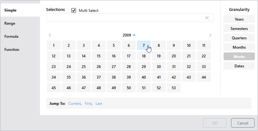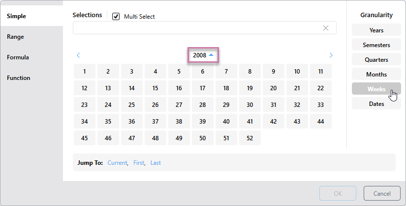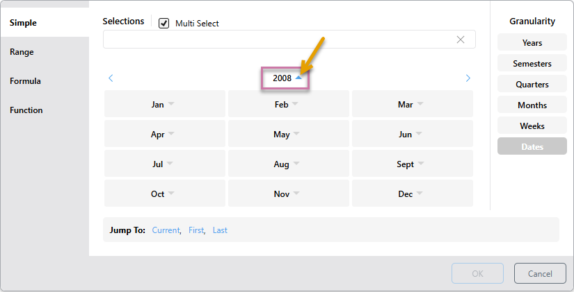 • Current: Depending on the given level of granularity, selects today's date (if it exists in the system) or the current year, semester, quarter, month, or week. If the current date-time period doesn't exist in the system, the last date-time period will be selected instead.
