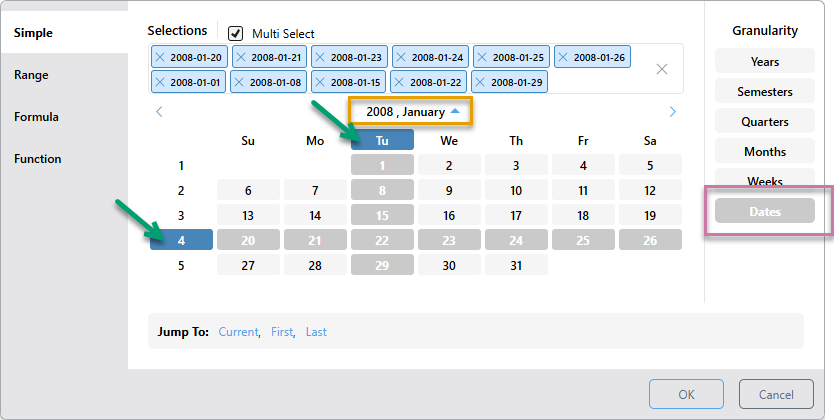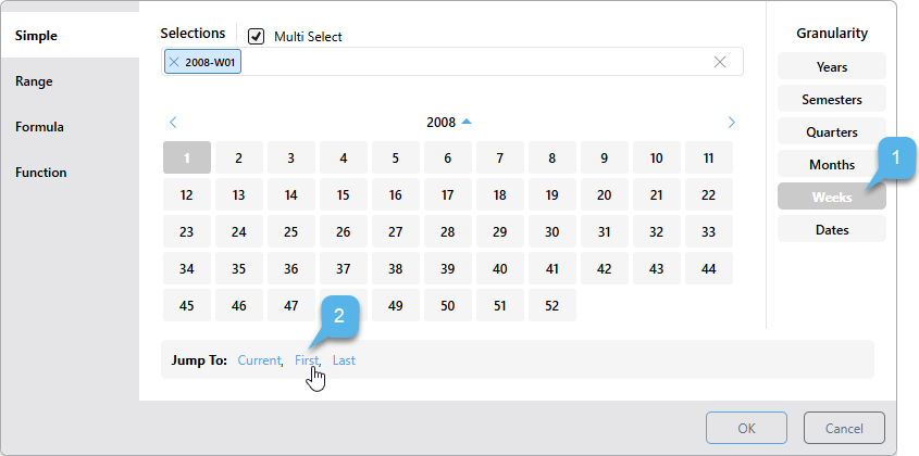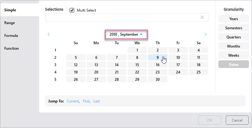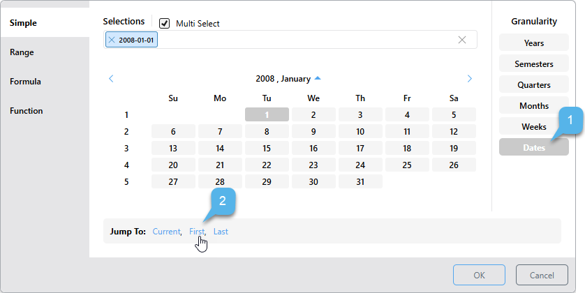 • First: Selects the first date-time period in the system according to the selected level of granularity. If the granularity is set to Dates, the first date in the system will be selected; if the granularity is set to months, the first month in the system will be selected; and so on.