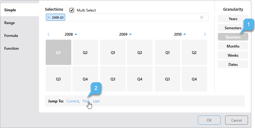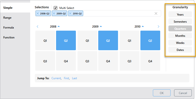 The quick selection options provide a shortcut selection for filtering by the current, first, or last date-time period at the current level of granularity.