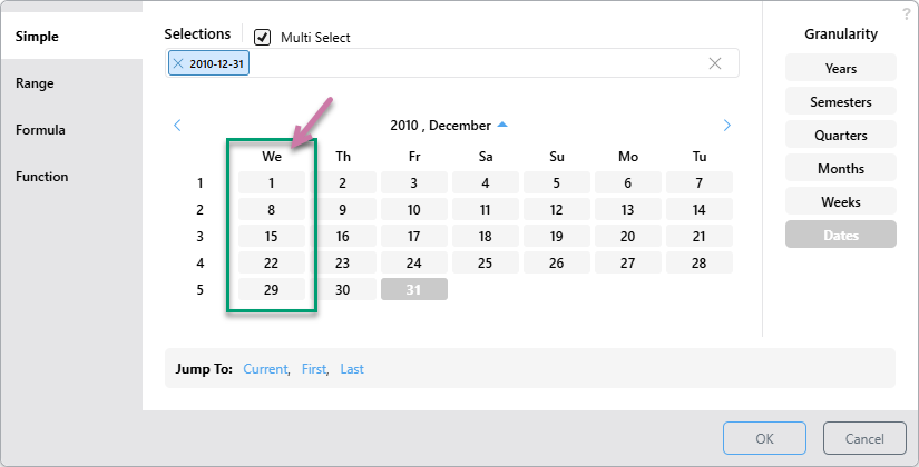 In the example above, Week Start On was set to Wednesday (purple highlight). This affects the Date Calendar as follows: