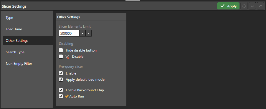 From the Other Settings tab, you can disable and enable the filter button, background chips, and auto run for the slicer: