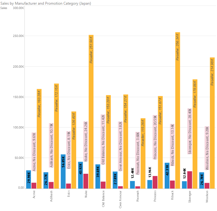 Here, the data labels were formatted differently for each data series. For Customer (in blue) the labels were simply set to bold. For No Discount (in red), the labels were placed outside, with a background color applied, and both series and category were enabled. For Reseller (in yellow) the labels were placed at the top and italicized, and the series label was enabled.