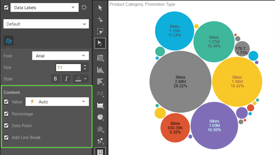 In this example, the value, percentage, and data point are displayed in the data labels with a line break between each label: