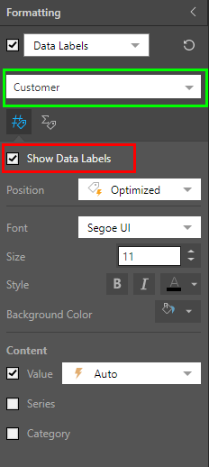 - Select the Data Labels checkbox at the top of the Formatting panel (purple arrow above).