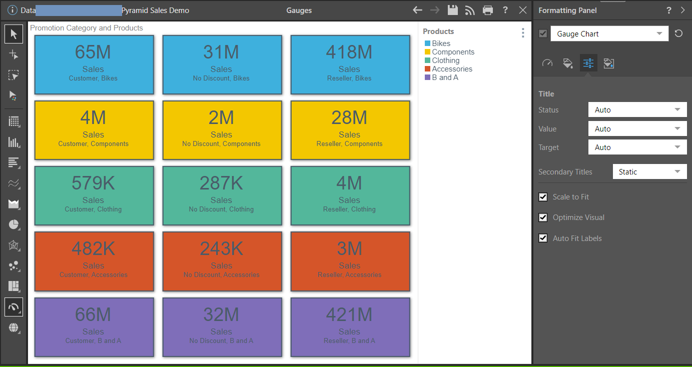 - Auto Fit Labels: Toggle between auto fitting the labels to the space available and using fixed sizes for the label text. Note: When Auto Fit is off, the font sizes are determined using the Gauge Labels settings.