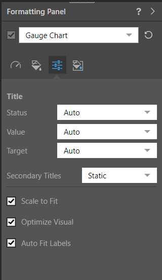 - Secondary Titles: Set to Static to show value labels as "Status," "Value," and "Target." Set to Dynamic to use the current measure as the title.