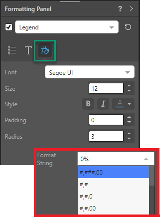 - Format String: (continuous legends only, red) change the format string in the legend.