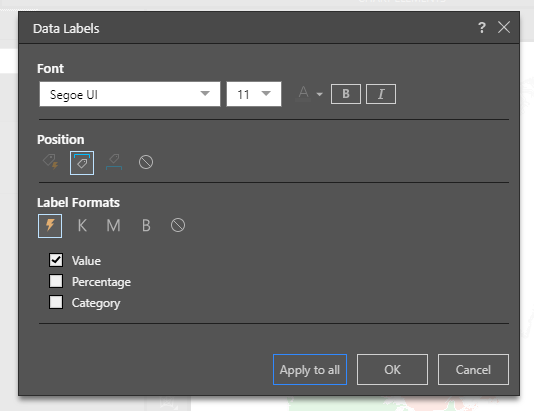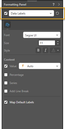 From the Formatting panel, you can change the font type, size, and style for the data labels, and you can adjust the content of the labels.