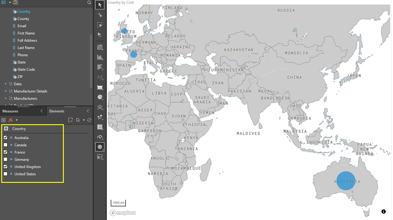 In this example, Costs are shown for Australia, France, and the UK. The map is focused on those locations, but does not show the Americas.
