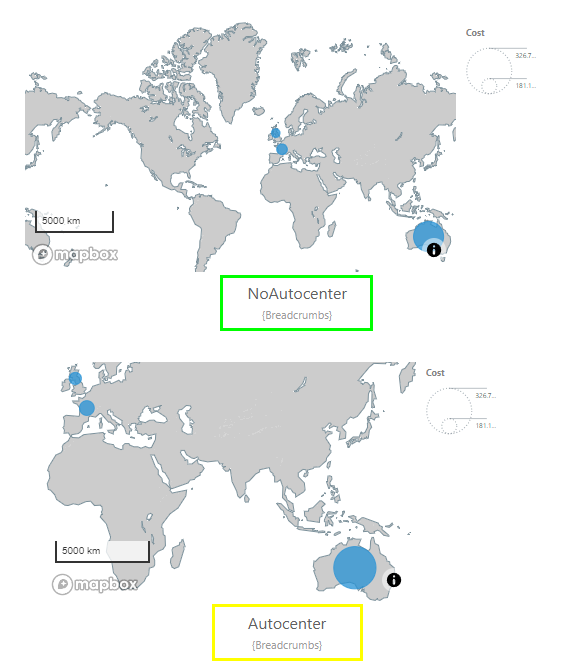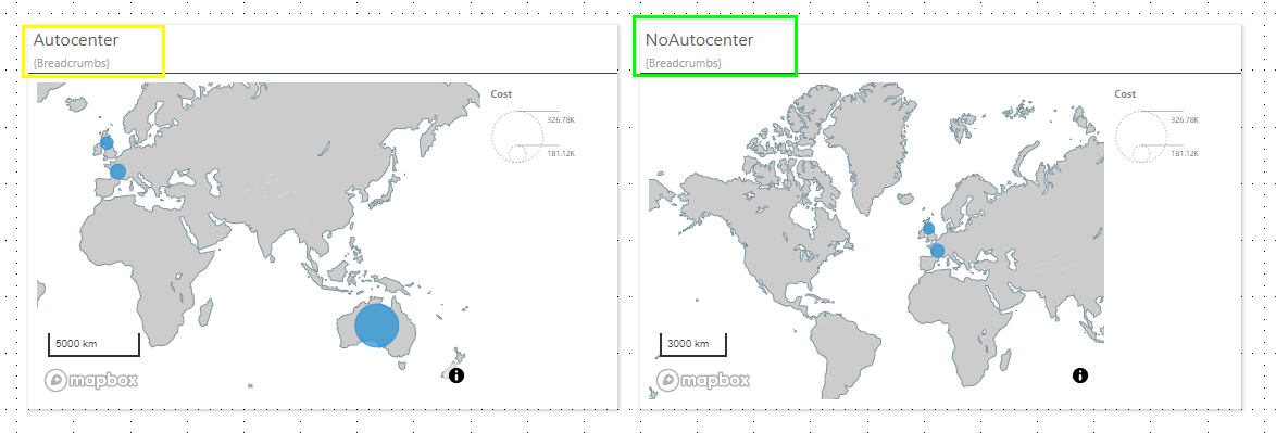 When added to Present the auto centered map (on the left below) is centered to show the given countries. When auto center is disabled (on the right below), the map is zoomed and focused in the position in which it was saved from Discover.