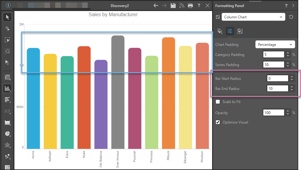 - Bar End Radius is 10. This means that the end of each column (the furthest point for each, shown inside the blue box above) is curved with a radius of 10. You could increase or decrease this value to make the curved corners more or less pronounced, respectively.