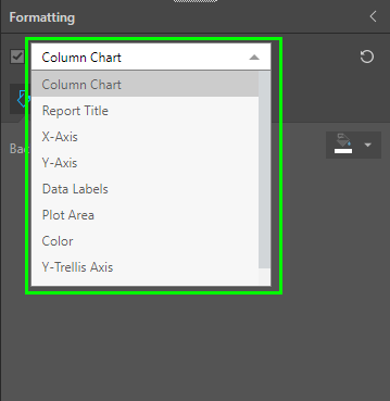 - Chart: Select the Chart Type (one of Column Chart, Bar Chart, Line Chart, or Area Chart) to set its formatting.