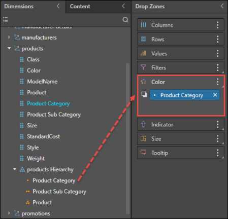 Open the Products Dimension, and then open the Products Hierarchy; add the Product Category level to the Color drop zone.
