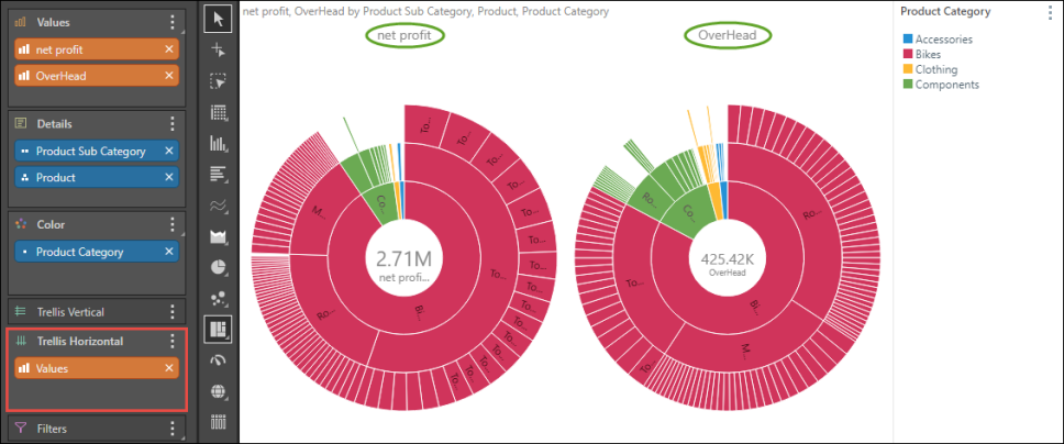 Add the Overhead measure to the Trellis Horizontal zone to compare net profit with overhead across 2 charts.