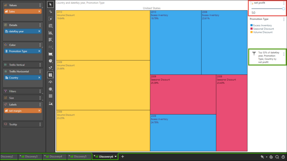 Using the Sample Demo model, add the Promotion Type hierarchy to the Color drop zone;