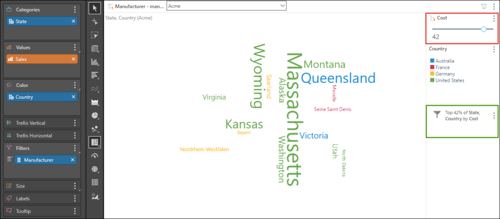 Add the Sales measure to the Values zone; you will now see a word cloud displaying sales by state, color-coded by country.