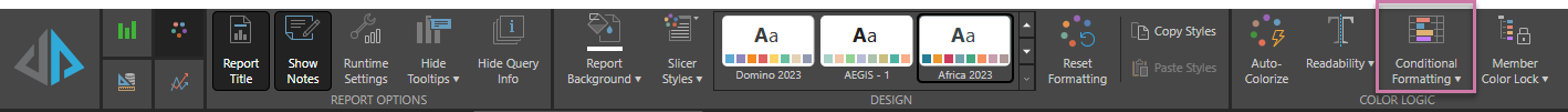 The CF dialog can be opened by clicking the Conditional Formatting button in the Design ribbon of Discover. The dialog will slide up from the bottom of the screen.