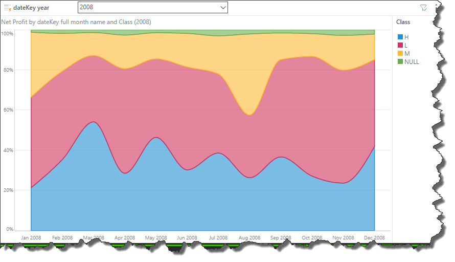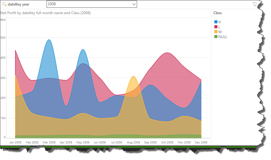 As with other Cartesian charts, you must have at least 1 measure in the Values zone and 1 hierarchy in the Categories zone. This will produce a basic area chart, plotting the data points representing the value for each hierarchy element. In this example, the chart plots net profit by month: