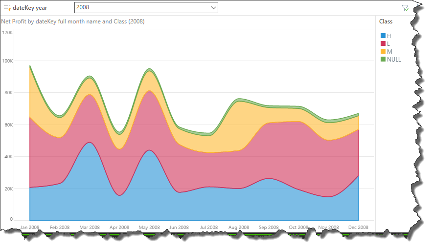 Here, a second hierarchy, Class was added to the Color zone. Now the chart shows net profit by month for each product class.