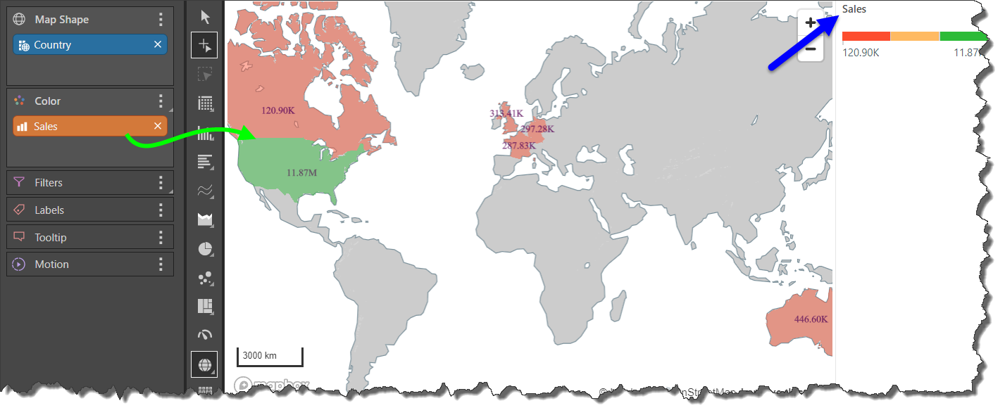 Add the Sales measure to the Color zone; the color of each country will be driven by the sales measure (green arrow). The color scale can be read from the Sales legend (blue arrow).