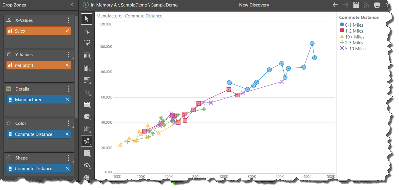 In this example, the chart shows sales and net profit for commute distance by manufacturer. Commute distance was also added to the Shape drop zone in order to more easily differentiate the commute distances in the visual. This also produces a combined color shape legend.