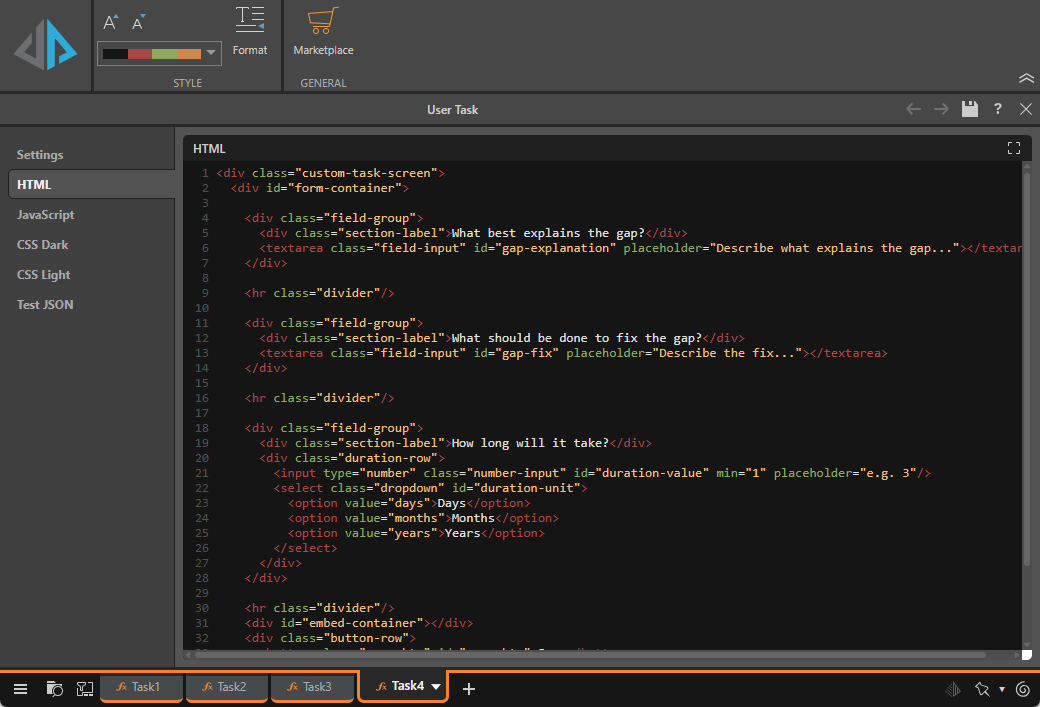 The User Task designer in Formulate, allows users to create their own task interfaces, functionality and logic using a combination of HTML, CSS, JavaScript and Pyramid's task API. They can be further extended to work with external applications through their APIs. Saved User Tasks are sharable, reusable and governable like all other elements in the Pyramid Catalog.