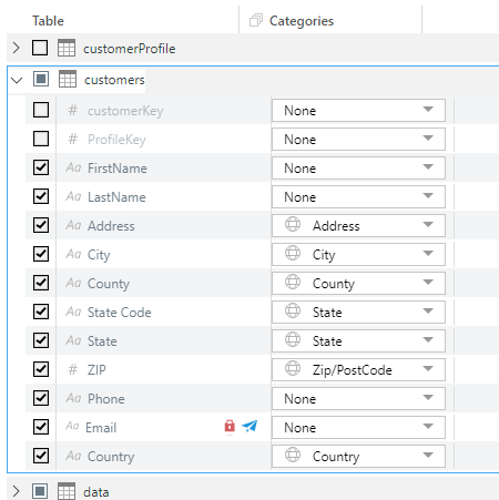 Columns can be categorized using Pyramid's AI column categorization feature. Right-click on the table name and select AI Column Categorization. The system will generate categories (if applicable) for all columns that have not been assigned to a category.