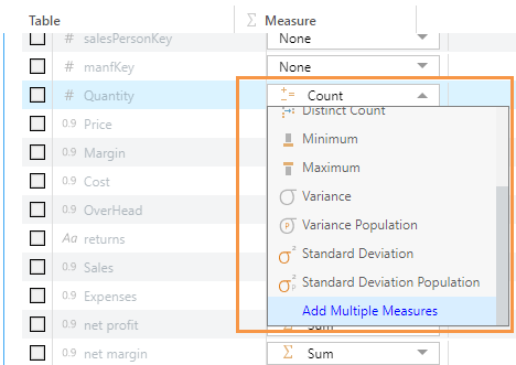 To assign multiple measures to a column, scroll down the drop-down list and select Add Multiple Measures.
