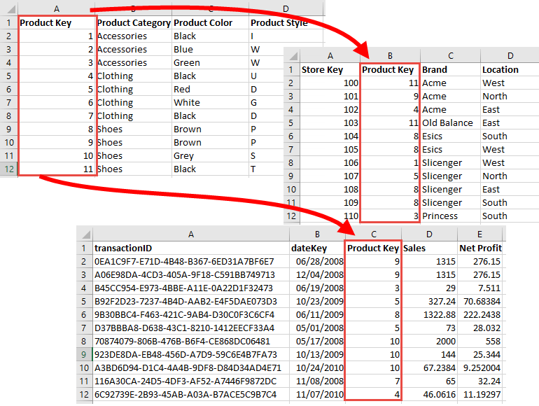 For example, a retail company may have a table that lists products, product color, and product style, another table that lists brands and store locations, and another table that lists sales and net profit.